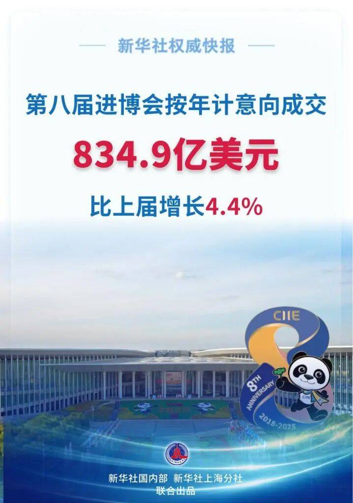 第八届中国国际进口博览会数据出炉,按一年计意向成交额834。9亿美元,比上届增加4。4%,创汗青新高。