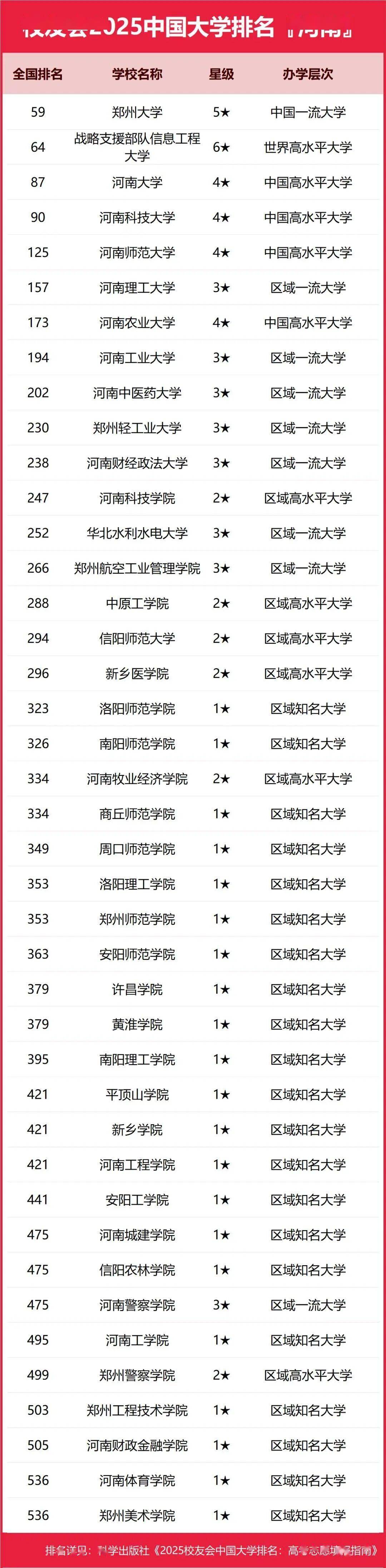 校友会2025中国大学排名(河南)火热出炉,充实展示了华夏大地高档教育的兴旺朝气!领跑者郑州大学稳居全国59位,荣膺中国一流大学,计谋援助部队消息工程大学同样跻身顶尖行列。河南大学、河南科技大学实力强劲,双双进入全国百强。河南师范大学、河南农业大学等校持续前进,配合建立了河南高教的第一梯队。前300强中河南高校占领15席,全体实力稳步提拔。
